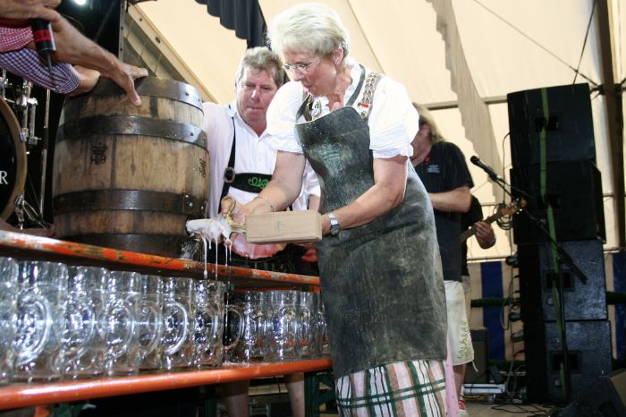 Festwirt Jochen Mörz ließ es sich nicht nehmen, Bürgermeisterin Cornelia Irmer eine Lederschürze umzubinden. Nach drei zielsicheren Schlägen hatte die Rathauschefin das Faß angezapft, und erklärte um 19.49 Uhr das Sommerfest für offiziell eröffnet. Während im Zelt aufgrund der hohen Temperaturen viele Plätze frei blieben, füllte sich der dahinterliegende Biergarten rasch. Die Stimmungshits der Band „Münchner Gschichtn“ waren auch dort gut zu hören.