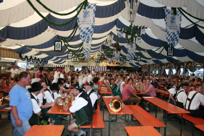 Schon zwei Stunden vor dem Anstich im Festzelt versammelten sich rund 1.000 Menschen auf dem Karl-Lederer-Platz – rund 700 nahmen am anschließenden Umzug teil. Bei Temperaturen über der 30-Grad-Marke schenkte Festwirt Jochen Mörz zunächst Freibier und Wasser aus. Sofort bildete sich eine lange Schlange durstiger Menschen vor dem kleinen LKW, an dem zwei große Fässer Tegernseer Hell angezapft wurden. Nach nicht einmal einer halben Stunde versiegte der Getränkevorrat. Die Musiker der zahlreichen Kapellen nutzten die verbleibende Zeit bis zum Beginn des Festumzugs und gaben kleine Standkonzerte.