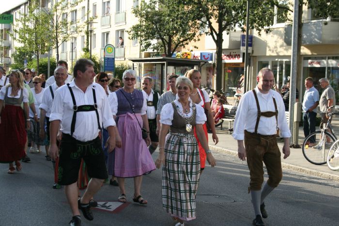 Begleitet von den Klängen der Musikkapelle Königsdorf, der Gartenberger Bunkerblasmusik und dem Spielmannszug Gelting setzte sich der Umzug um kurz nach 19 Uhr in Bewegung. Hinter einem Gespann des Herzoglichen Brauhauses Tegernsee folgten unter anderem Delegationen der Eghalanda Gmoi sowie Trachtengruppen der Banater Schwaben, Ungarndeutschen, Schlesier, Siebenbürger Sachsen und eine griechische Gruppe. Die Cheerleader des ESC Geretsried, Sportler des TuS Geretsried sowie der Isartaler Volkstanzkreis sorgten für weitere belebende Showelemente. Das Ende des Zuges bildeten die Feuerwehr, das Bayerische Rote Kreuz und ein Alpenlandtraktor. Auf der gut einen Kilometer langen Route über die Egerland- und Jahnstraße standen viele Schaulustige Spalier. Nach gut zwanzig Minuten war schließlich das Festzelt erreicht.