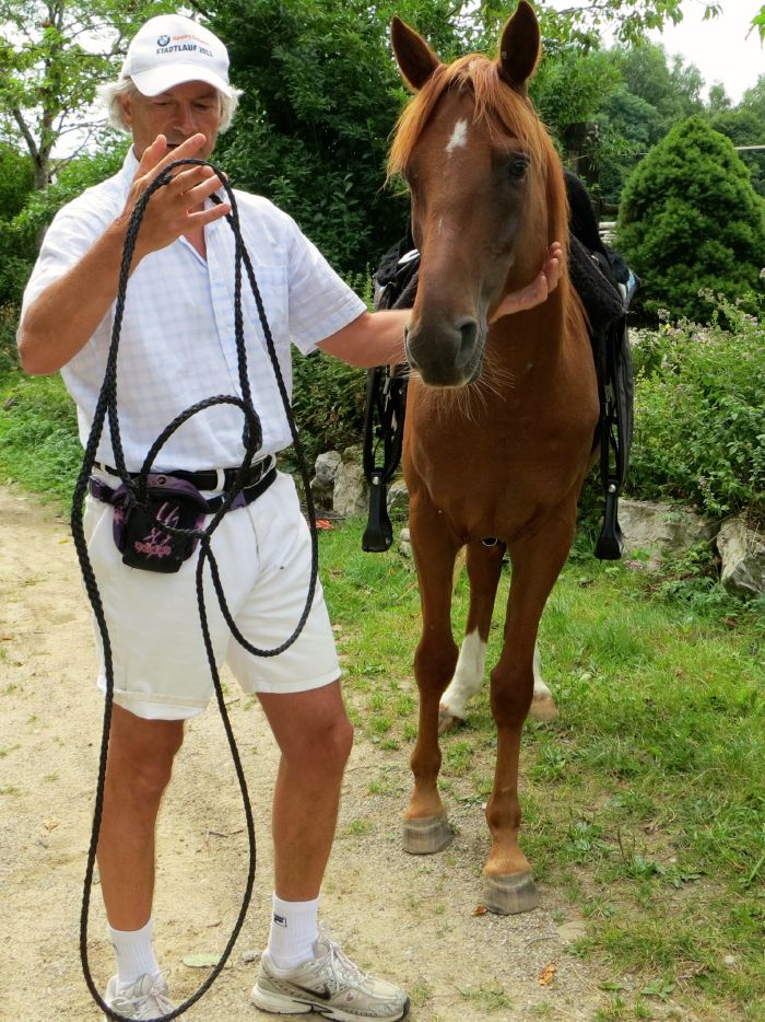 „Ich glaubte, dass ich ohne Ausbildung ein guter Pferdehalter und Reiter werde und ein Tier wie Dhakir zähmen kann. Ich unterschätzte, dass dieses Rassepferd sechs Jahre wild auf der Koppel lebte.“ Diese Einsicht war schwer, aber Gustl tat das Richtige. Er gab Dhakir in die professionellen Hände des Reittrainers Fred Rai, der auch bekannt ist als Intendant der berühmten Karl May-Festspiele in Dasing. Gustl entschied sich für Rai, weil er einen ganz besonderen Stil lehrt, einen der an das Reiten der Indianer erinnert. Der „Rai-Sattel“ ist ungewöhnlich leicht und weich gepolstert, das Kopfstück besteht aus leichtem Seil ohne Gebiss - das sogenannte Bändele. Zwei Monate blieb Dhakir bei diesem Ausbilder. Drei bis vier Tage pro Woche trainierte Gustl mit und erwarb das bronzene Reitabzeichen und das bronzene Geländereitabzeichen. Sie beide lernten wie sie richtig kommunizieren. „Ho-Ho“, erklärt Gustl, ist ein Beruhigungslaut und Belohnungston, der dem Pferd auch die Angst nehmen soll. Immer wenn Dhakir etwas gut gemacht hat, bekommt er mit einem „Ho-Ho“ ein Leckerli. „Ho-Ho“ bedeutet für das Tier etwas Gutes, etwas Vertrautes. „Im Ernstfall, wie einst bei dem roten Radler, kann ich ihn nun mit einem „Ho-Ho“ beruhigen.“