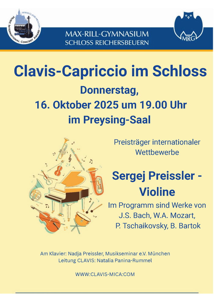 Erleben Sie das erste Konzert der Reihe Clavis Capriccio im Schloss am Max-Rill-Gymnasium. Der international ausgezeichnete Violinist Sergej Preissler präsentiert gemeinsam mit der Pianistin Nadja Preissler ein abwechslungsreiches Programm mit Werken von J.S. Bach, W.A. Mozart, P. Tschaikovsky und B. Bartók.
