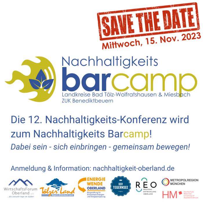 Veranstalter des NachhaltigkeitsBarCamps ist das WirtschaftsForum Oberland e.V. in Kooperation mit der REO Regionalentwicklung Oberland, der Bürgerstiftung Energiewende Oberland, der Metropolregion München, dem TIZIO Transfer- und Innovationszentrum im Oberland der Hochschule München, dem Tölzer Land Tourismus und der Tegernseer Tal Tourismus GmbH.