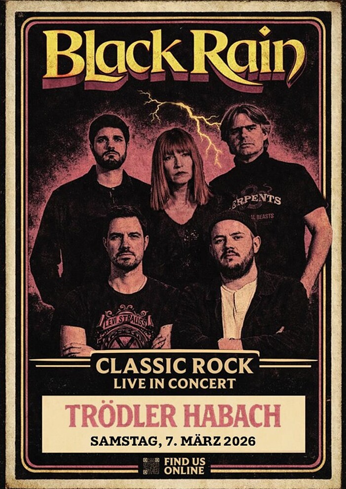 Nach elf Jahren Pause kehrt die Rockband Black Rain zurück auf die Bühne. In teils neuer Besetzung und gewohnter Manier gibt die fünfköpfige Gruppe Rockhymnen von Legenden wie Deep Purple, Led Zeppelin, Queen, ZZ Top, u.v.m. zum Besten. Kernige Rock-Riffs, gepaart mit einer kraftvollen Stimme, ausschweifenden Soli und dynamischen Rhythmus-Parts lassen den Funken gleich überspringen und bringen die Stimmung garantiert zum Kochen. Ein Muss für alle Rockbegeisterten! Weitere Infos zur Band auf Facebook & Instagram unter "blackrain.rockmusic".
