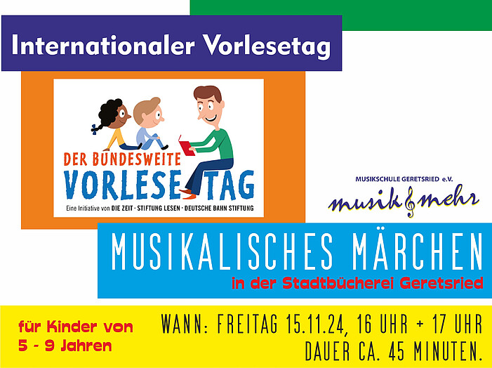 Internationaler Vorlesetag – Musikalisches Märchen mit der Musikschule – für Kinder von ca. 4 bis 8 Jahre: 16 Uhr + 17 Uhr. Dauer ca. 40 Minuten.