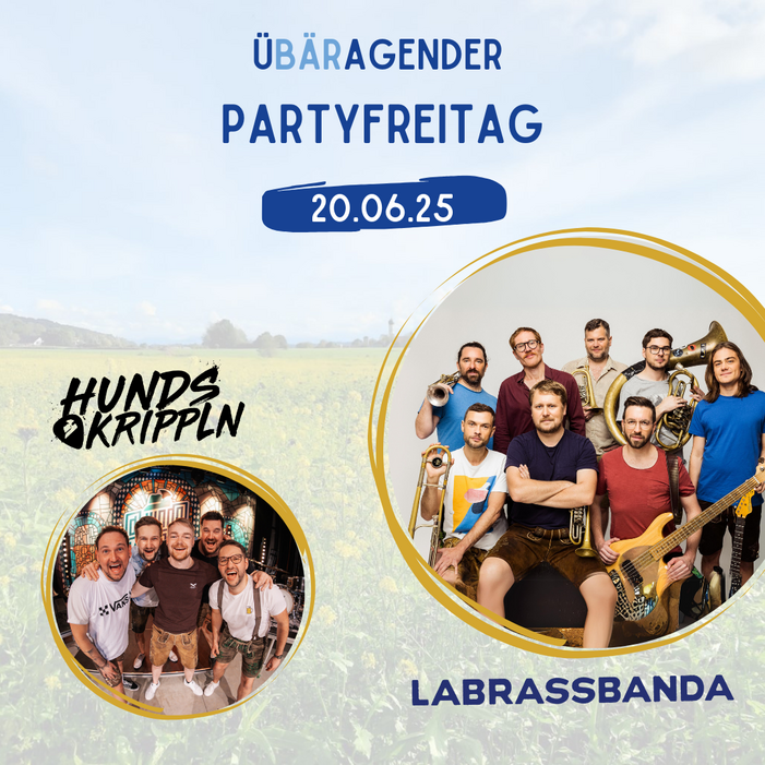 Am üBÄRagenden Partyfreitag spielt ab 20:00 Uhr die Vorband "D´Hundskrippln" und im Anschluss "LaBrassBanda" in unserem Festzelt auf.
