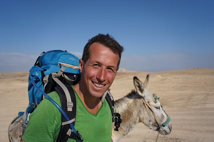„180 Kilometer mit einem sturen Esel durch das bedrohliche Heilige Land. Von den Bergen Galiläas durch Olivenhaine, die Tiefen des Jordantals, die sengende Hitze der judäischen Wüste, begleitet von gastfreundlichen Hirten und Herden bis hin zum Stall in Bethlehem. Ein Pfad, auf dem ich viele Grenzen überwinden und mich häufig fragen musste, wer hier eigentlich der Esel ist“.