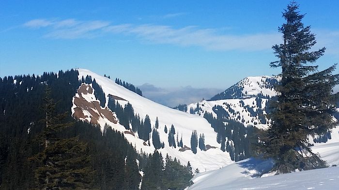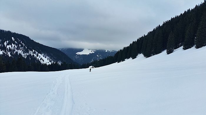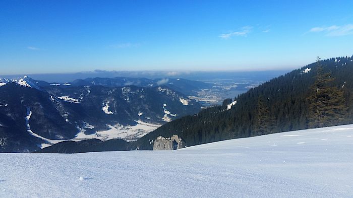 Die Abfahrt folgt der Aufstiegsspur bis in den Talgrund und zum Parkplatz Hufnagelstube in der Valepp. Von dort brauchen die Tourengeher dann allerdings ein Taxi bis zur Talstation der Wallbergbahn.