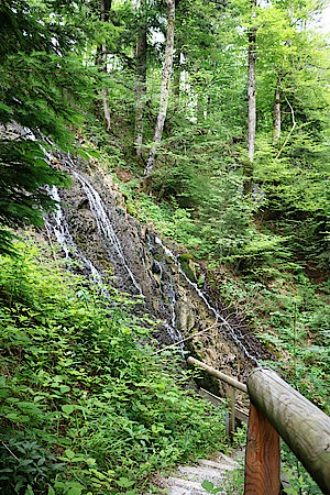 Dann ist der Wanderer dem Rottachfall ganz nahe. Tief hat sich das Wasser in den Fels gegraben. Das Nass stürzt in mehreren Stufen hinab. Dazwischen sammelt sich das Wasser in großen Gumpen. Moose und Flechten überziehen die Felswände im engen Grund mit grünen Matten. Über Treppenstufen geht es mit dem Rottachfall im Blick wieder zur Mautstraße hinauf. Bevor die Wanderer weitergehen, sollten sie sich am Wasser Zeit nehmen und das Naturschauspiel genießen.