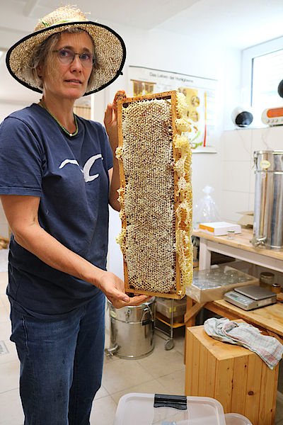 Um eine Bienenkönigin bildet sich jeweils ein Volk. Sie ist deutlich länger als Arbeiterinnen und Drohnen und im Unterschied zu diesen auch das einzig geschlechtsreife Weibchen im Stock. „Bis zu 40.000 Bienen kann ein gesundes Volk haben“, sagt Katrin Stefferl. Im Juli hat die Imkerin die meiste Arbeit mit ihren Tieren. Denn dann beginnt die Hochphase der Erntezeit. Sie sammelt die prall mit Honig gefüllten Waben aus den Stöcken ein. Im Keller ihres Hauses muss sie erst einmal die Wachsschicht entfernen, mit denen die Bienen die Waben verschlossen haben. Erst danach lassen sich diese schleudern, um schließlich reinen Honig zu gewinnen. Im Herbst und Winter sollten sich die Bienen ausruhen können. Dass etwa im vergangenen Jahr auf einem benachbarten Feld ein Landwirt Ackersenf ausgesät habe, sei eher schlecht, sagt Katrin Stefferl. Denn dadurch seien die Bienen, als die Pflanzen im November blühten, noch einmal ausgeflogen und hätten kostbare Energie verbraucht.