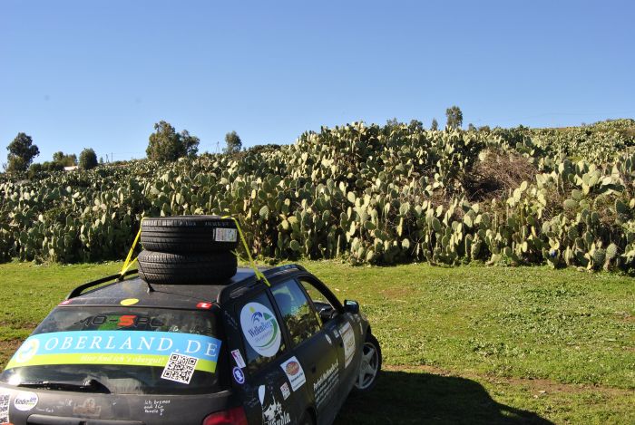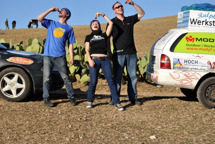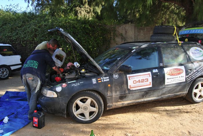 In Windeseile tauschten wir die Reifen aus stießen nach 5 km auf drei weitere Teams. Gemeinsam haben wir in einer entzückenden Lokalität in den Bergen zu Mittag gegessen - es gab Ziege in Olive. Nachmittags ging es heiter weiter bis sich der Motor unseres Audis auf ungesunde Temperaturen erhitzt hatte. Ralph und Steffen (vom Team Dustfighters, nachträglich hinzugestoßen) waren sofort zur Stelle. Unser Zusatzelektrolüfter war ausgefallen. Dieser wurde sodann kurzgeschlossen und direkt mit der Batterie verbunden - Problem behoben.