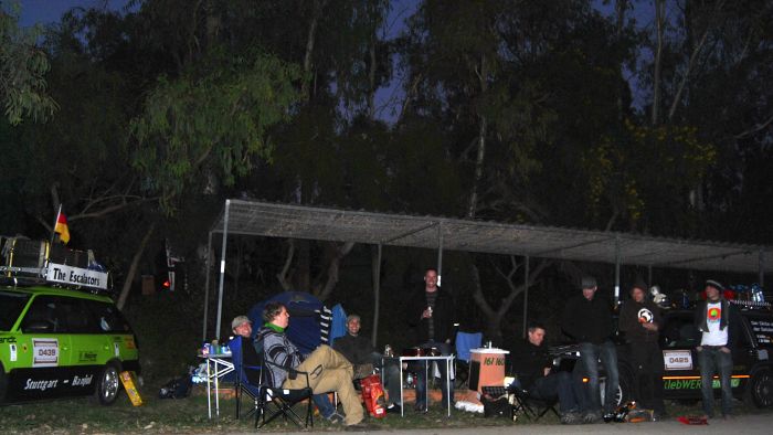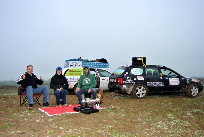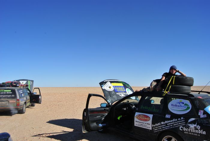 Den heutigen Morgen verbrachten wir mit der Reparatur unserer Ölwanne mit freundlicher Unterstützung der Teams Franken, den Wüstenhunden, dem Polarexpress sowie Olaf und Torsten von der Organisation. Gegen Mittag hatten wir eine lustige Begegnung mit einem Oldtimer-Fahrer, die damit begann, dass dessen Auto nicht mehr ansprang und damit endete, dass er uns eine große Platte Reis mit Fisch und Gemüse für sechs Personen zu Mittag brachte, welche vorzüglich mundete.