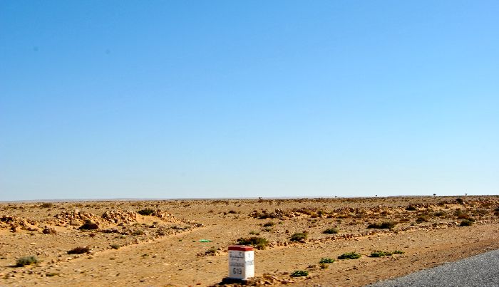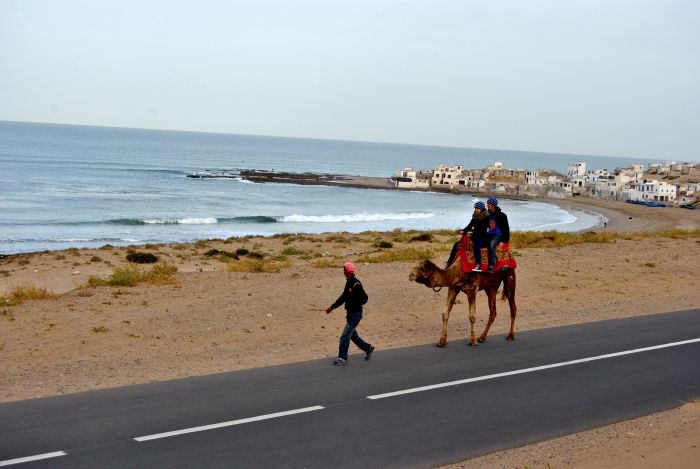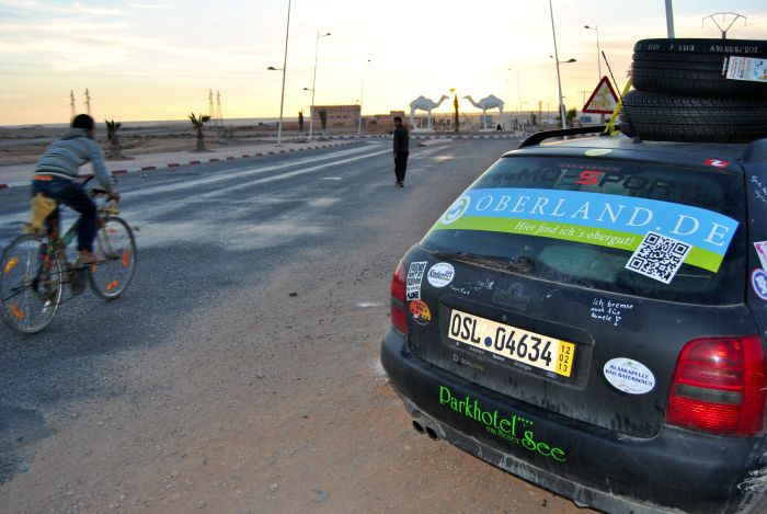 Danach ging es weiter zur nächsten Tankstelle, denn die Luft in den Reifen musste nachgefüllt werden. Zu sechst (Ralph's Werkstatt, Team Franken und Team Scharf) frühstückten wir dann ausgiebig leckeres, selbstgemachtes Fladenbrot mit Marmelade, Erdnussmus und Ziegenkäse. Nun ging es zur letzten großen Einkaufsmöglichkeit vor Nouakchott – Wasser, Feuchttücher, Käse und Casablanca-Bier. Fünf Stunden südlich fahren hieß es nun. Zu dritt konnten wir uns die Zeit super mit Walkie-Talkies vertreiben. Ganz obligatorisch hielten wir an den zwei Kamelstatuen vor Tan-Tan, dem sogenannten „Tor zur Sahara“. Allgemeines Etappenziel für den heutigen Tag war ein Beduinenlager kurz vor Laâyoune, an dem wir kurz vor Mitternacht ankamen.