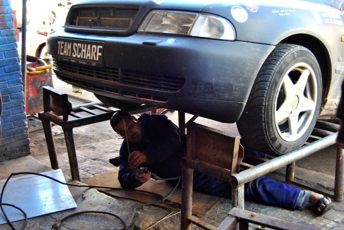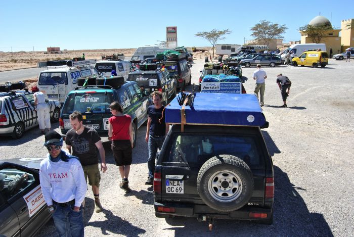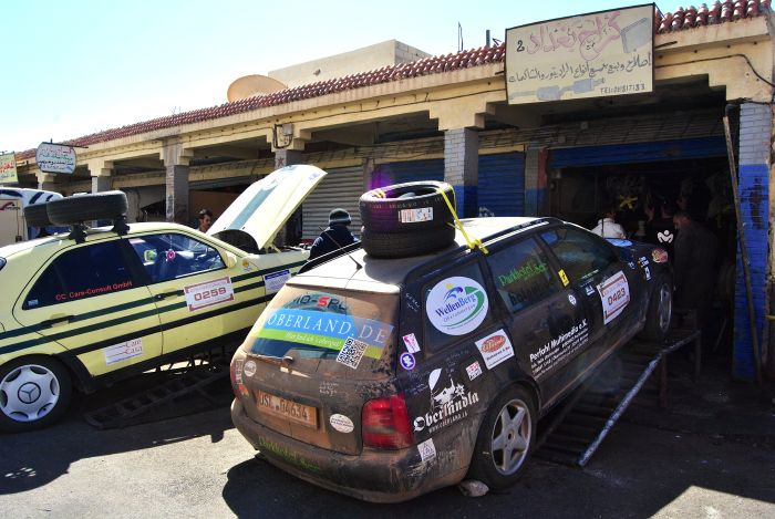 Heute haben wir einen Ruhetag eingelegt, da es morgen für fünf Tage nach Mauretanien geht, das heißt Wüste, Wüste, Wüste. Da wir für den Audi noch einen massiven Unterbodenschutz benötigten (der bisherige war aus Plastik – toi, toi, toi, das der Audi alles ausgehalten hat, was wir ihm bisher zugemutet haben), damit uns in der Sahara die Ölwanne nicht aufreißt. Hierfür sind wir nach Dakhla gefahren, wo es eine faszinierende Werkstattstraße gibt. Für Benzin und Wasser haben wir bereits gesorgt. Nun sind wir gerüstet für den härtesten Abschnitt der Rallye. Ab morgen fahren wir größtenteils im Konvoi. Von Mauretanien bis Nouakchott werden wir vermutlich keinen Internetzugang haben.