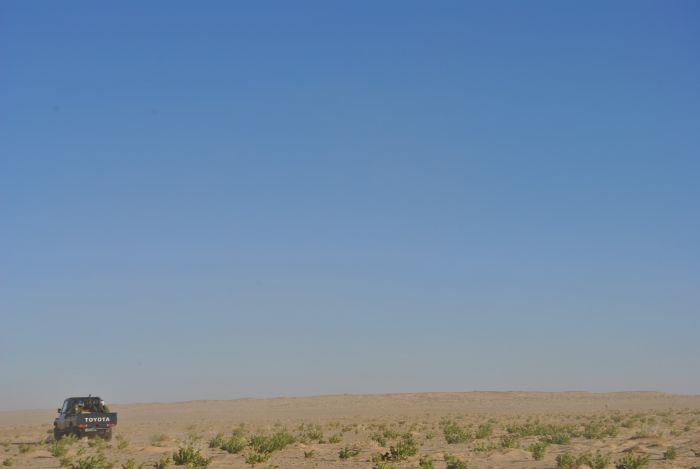 Heute sind wir nach kalter Salzwasserdusche aufgebrochen, um eine Etappe über 500 km durch Steppenlandschaft zu meistern. Diese war relativ unspektakulär; der Audi schlug sich wacker. Unterwegs ist uns kaum etwas begegnet, bis auf Nomadenzelte, Sanddünen, eine rote Schlange und Kamelkarawanen.