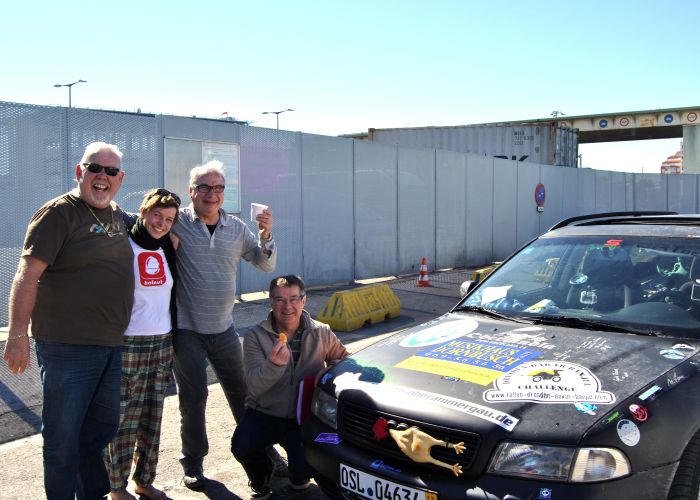 Anbei ein Schnappschuss von den beiden scharfen Rallyefahrern :) und ein Bild vom männlichen Fahrerlager. Wir sammeln uns heut Abend am Campingplatz La Casita bei San Roque, um morgen gebündelt den Kontinent zu verlassen. Ein Team hatte wohl schon einen Motorschaden bei Alicante und wird nachkommen. Mit allen, die heut noch ankommen, trinken wir gleich noch auf die ersten gemeisterten Etappen. Wir wurden heut morgen von der spanischen Polizei geweckt, was darin endete, dass beide Polizisten unser Rallyeauto signierten. Seinen Zeigefinger hat er bereits ein paar Tage vor Rallyebeginn lädiert. Ist schon besser und wieder gut zusammengewachsen. Keine Schiene mehr nötig. Wir freuen uns bereits auf Marokko und das hoffentlich noch wärmere Wetter!
