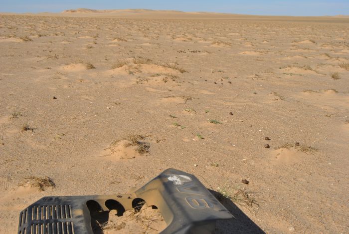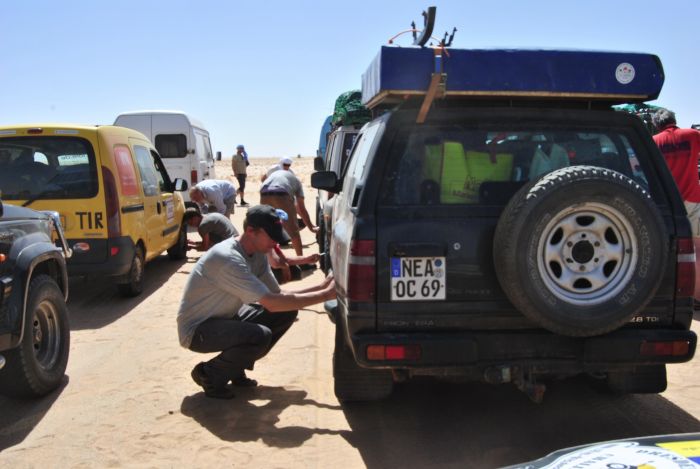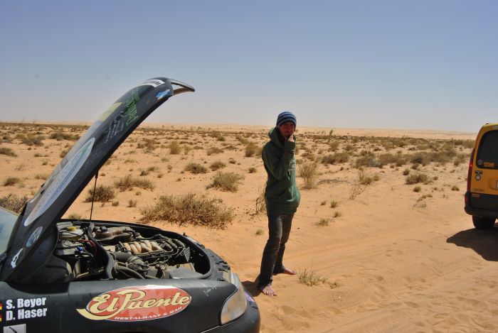 Nach zwei Tagen mit Sandlöchern, Waschbrettpisten, Kamelskelette, Dünenüberquerungen, Fata Morganen und sandgeschwängerter Luft wurde unser Motor so heiß, dass wir beschlossen, seine Plastikabdeckung abzuschrauben. Seit der mauretanischen Grenze wurden wir – obwohl weit und breit niemand hauste – vom Militär und Wüstenführern begleitet. Die vier Wüstenführer waren dafür verantwortlich, Tiefsand und unpassierbare Stellen auszumachen. das militär fährt, laut Veranstalter, in unregelmäßigem Rhythmus mit, um uns in etwaigen schwierigen Lagen Sicherheit geben zu können.