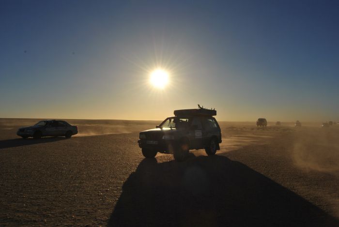Die Westsahara-Region ist sehr heiß, trocken und scheint endlos zu sein. Der Horizont flimmert und wir haben bereits unsere erste Fatamorgana gesehen. Die Straße, auf der wir fuhren, war in sehr gutem Zustand, sodass wir mit unserem Audi zügig vorankamen und gegen Abend noch einige andere Rallyeteams überholten. Heute hatten wir endlich die Gelegenheit, einen Sonnenuntergang an einer Klippe über dem Atlantik zu beobachten.