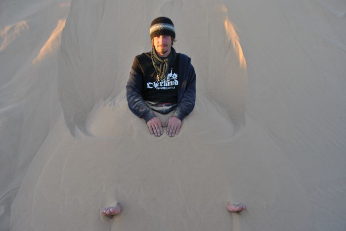 Während des Sonnenuntergangs verließen wir den Atlas Richtung Atlantik. Hier wartete bereits das nächste Abenteuer: Wir waren völlig ermattet und auf der Suche nach einem geeigneten Schlafplatz am Meer. Bevor wir uns versahen, steckten alle drei Teams mit ihren Fahrzeugen innerhalb fünf Minuten im Sand fest (Rallyerekord). Team Franken und Team Scharf steckten 10 m vom Wasser entfernt am Strand fest; Ralphs Werkstatt steckte oberhalb der Dünen. Erst mal ein Lob an den Audi: Wo wir feststeckten, wären andere erst gar nicht hingekommen. Nachdem wir die Luft aus unseren Reifen genommen hatten (Daniel lässt die Luft mithilfe seiner Sonnenbrille raus), fuhr uns der Audi problemlos in Sicherheit. Die anderen mussten sich mit Klappspaten, Gummimatten, Steinen und Manneskraft weiterhelfen. Zudem stieß der Wächter der nahegelegenen Räderei zu uns und half den beiden Autos, die am Strand steckten, den Weg nach oben zu finden. Wie sich herausstellte, half dies dem Teambuilding ungemein. Alle hatten mächtig viel Spaß und fielen gegen Mitternacht unterm Sternenhimmel ins wohlverdiente Koma.