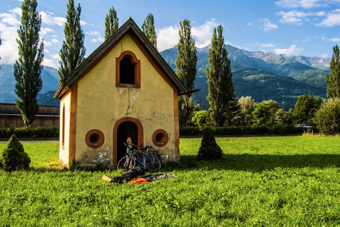 „Wir übernachteten wie die Pilger an einer alten Kapelle unter freiem Himmel. Geweckt wurden wir von einem alten Mann der in der Kapelle beten wollte und seinen Schäferhund dabeihatte. Nachdem wir unser Gepäck um zwei Konservendosen erleichterten, fuhren wir los Richtung Innsbruck. Die Strecke von Telfs nach Innsbruck war an dem Fluss Inn entlang unerwartet flach und hindernislos. Bis auf Daniels gebrochenen Gepäckträger kamen wir unversehrt – noch immer ohne Muskelkater – in Innsbruck an.