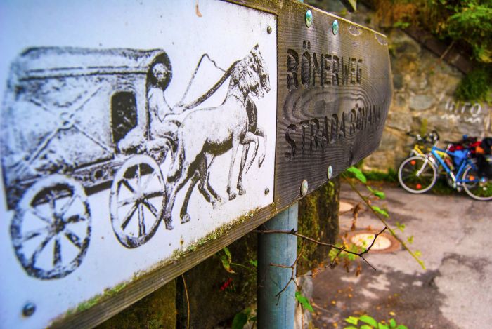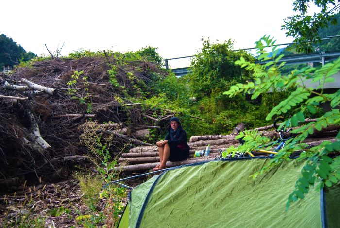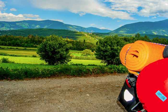 Zusammen mit einem Rucksackreisenden gingen wir in den Bunker, der in sehr gutem Zustand und labyrinthhaft verzweigt war. Das gesamte nördliche Südtirol beherbergt ein Bunkernetzwerk, das früher die Annektion Norditaliens durch das Dritte Reich verhindern sollte. Die alte Römerstraße Richtung Brixen ist gesäumt von vielen alten leerstehenden Bauwerken. Bei Brixen sahen wir endlich die ersten Weinberge und Apfelbaumplantagen. Wir radelten weiter Richtung Bozen. Nach den ersten Regentropfen schlugen wir unser Lager kurz von Klausen auf. Es regnete die ganze Nacht hindurch.“