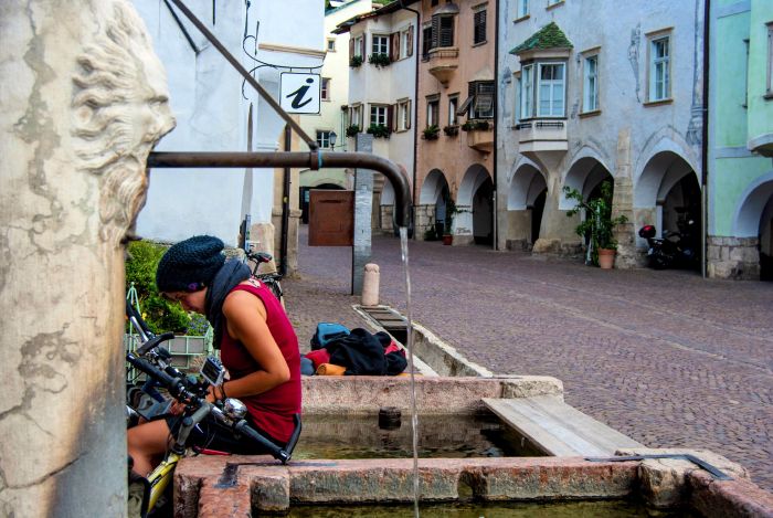 Überrascht von der menschenüberfluteten Innenstadt suchten wir uns ein zurückliegendes Eiscafé und besprachen die weitere Reiseplanung. Der Cafébesitzer zeigte uns die Richtung nach Trento. Auf dem Weg aus Bozen heraus sahen wir das Drususstadion. Ganz besonders lobenswert sind die vielen Quellen entlang des Fahrradweges, an denen man seine Wasservorräte auffüllen kann. Heute hatten wir ein weiteres Mal Gegenwind, der uns bis 17 Uhr nach Egna begleitete. Die Suche nach einer Internetverbindung war auch in diesem kleinen italienischen Ort schwierig. Wir haben dennoch einen Anschluss gefunden.“