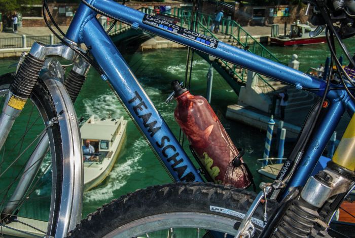 Von der Reise nach Venedig auf Drahteseln können wir seit heute nur abraten. Ab Mestre gibt es keinen geeigneten Fahrradweg mehr in die Stadt. Das Ziel vor Augen verfolgten wir unseren Plan dennoch und fuhren gegen 13 Uhr in die Stadt auf Stelzen ein. Auch Venedig selber ist natürlich nicht für Fahrräder konzipiert: Brücken und Treppenstufen zum Schweinefüttern – die natürlichen Feinde des beladenen Fahrradfahrers. Zu allem Überfluss ist heute Sonntag, das heißt alle Brücken in Venedig sind von Menschen mit Trollies, Kameras und Hunden überfüllt.