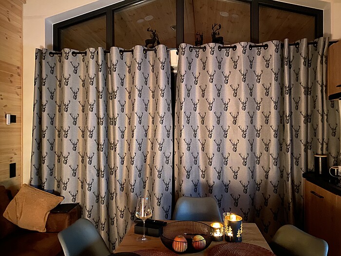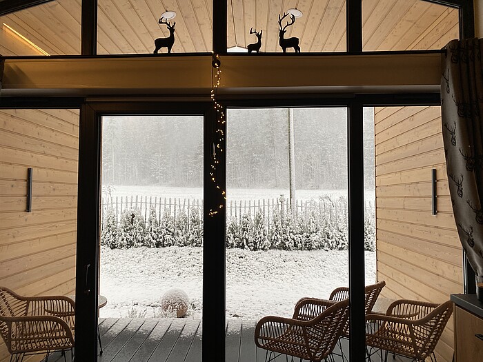 Wenn abends die Außenbeleuchtung die weiße Landschaft drum herum anleuchtet, der Schnee vor der Glasfassade im Wohnzimmer rieselt und der Wind durch den überdachten Freisitz pfeift, im Dunkeln der Kauz aus dem Wald ruft, dann ist Zeit nach einem langen Skitag für eine Tasse warmen Tee und wohlige Entspannung.