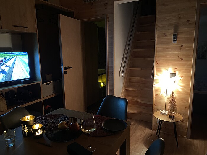Die 33qm großen Tinyhäuser sind für fünf Erwachsene ausgelegt. Mit vier Metern Raumhöhe wirkt der Wohnbereich größer als er ist. Dort befindet sich eine Küchenzeile mit Induktionsherd, Kaffeemaschine, Wasserkocher und einem großen Kühlschrank mit Eisfach. Es gibt eine Essgruppe mit vier Stühlen und einem Hocker, eine gemütliche Couch, Fernseher und genug Stauräume für die Wintersportklamotten. Im Erdgeschoss befindet sich ein abgeschlossenes Schlafzimmer mit Doppelbett und Kleiderschrank, sowie ein geräumiges Bad mit großer Dusche. Das Tiny ist an der Kanalisation angeschlossen, das heißt, man muss hier nicht wie bei einem Wohnwagen, die Entsorgung selbst übernehmen. Im Obergeschoss per Treppe erreichbar befindet sich ein abgeschlossener Raum mit drei vollwertigen Betten. Die Tiny-Häuser sind sehr geschmackvoll im modernen Alpenstil eingerichtet, in hoher Qualität.