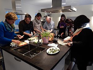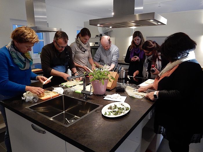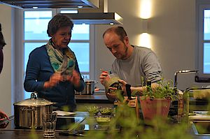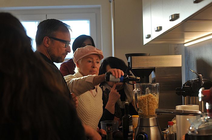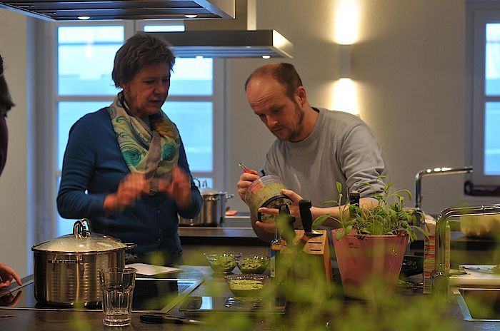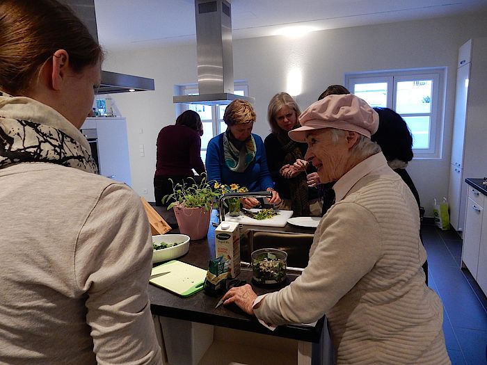 Zum Beispiel bei dem Kurs „Veganes Kochen - regional und mit Wildkräutern“ in der vergangenen Woche. Die Kräuterpädagogin und Natur-Coach Inge Bock lud die etwa 15 Teilnehmer zunächst auf eine kleine Kräuterwanderung ein, um die nötigen Grundzutaten für ein Drei-Gänge-Menü selbst zu suchen. Weil die Veranstaltung im Vital-Zentrum stattfand, bot sich der nahegelegene Kurpark an. Die gesuchten und gefundenen Kräuter wurden zu einem schmackhaften, erfrischenden Frühlings-Vitamin-Cocktail verarbeitet: Spitzwegerich, Löwenzahn, Brennnessel, Girsch und Frauenmantel wurden mit Zitronensaft, Mandelmilch, Äpfel, einer Prise Himalayasalz und etwa zwei Esslöffel Öl (vorzugsweise das geschmacksneutrale Rapsöl) vermischt und mit Agavendicksaft nach Gusto gesüßt.