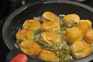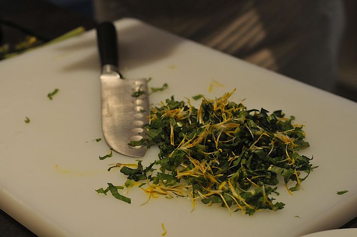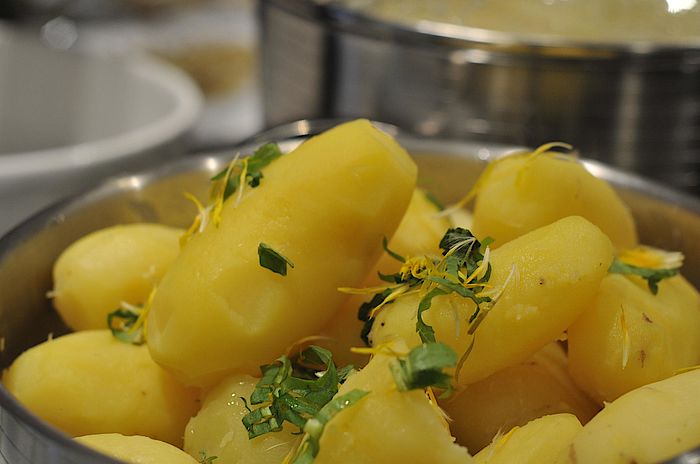 Für das Hauptgericht verfeinerte Bock zusammen mit ihren Teilnehmerinnen und Teilnehmern den Klassiker Spargel und Kartoffeln mit frisch gepflücktem und kleingeschnittenen Löwenzahnblüten – nicht nur optisch ein Kick, sondern auch geschmacklich. Statt Schnitzel oder Sauce Hollandaise bereitete Bock Falafel und eine Wildkräutercreme zu. Ihr Rezept für Falafel überraschte auch jene unter den Teilnehmern, die die Kichererbsenbällchen bereits seit Jahren kennen, mit würzigen Variationen: Die gekochten Kichererbsen (aus dem Glas sind sie direkt verwendbar, selbstgekochte aber sollten mehrmals gespült werden) zusammen mit einem guten, hocherhitzbaren Olivenöl in einem Mixer zu Brei pürieren. Bock fügte dann gemahlene Mandeln dazu sowie Kamut, eine Ur-Getreideform, das es in gut sortierten Bioläden zu finden gibt. Dazu gab die Kräuterpädagogin Hafer-Sahne, für die Würze mischte Bock Sojasauce, Pfeffer, Zwiebeln und Senf sowie etwas Muskatnuss und Hefeflocken unter. Die Masse zu Bällchen formen und in heißen Fett ausbacken. Für die Wildkräutercreme pürierte sie Bärlauch, Giersch, Löwenzahn und Brennnessel mit etwas Himalayasalz, Cashewnüssen, Öl und etwas frischem schwarzen Pfeffer zu einer Pesto. Als Nachtisch reichte die Erdbeeren mit Mandelsauce und frisch gepflücktem Waldmeister. Die Mandelsauce stellte Bock durch Mandelsahne her, die es in regionalen Bioläden und inzwischen auch in ausgesuchten regulären Supermärkten gibt, verfeinert durch Agavendicksaft und etwas Zitrone.