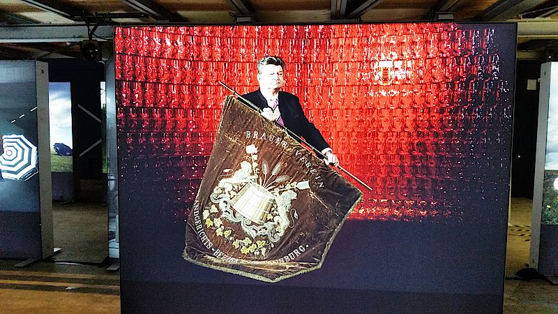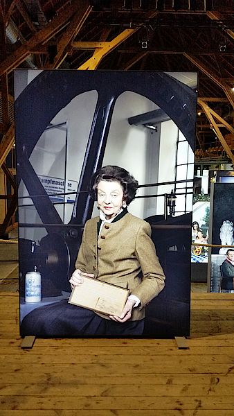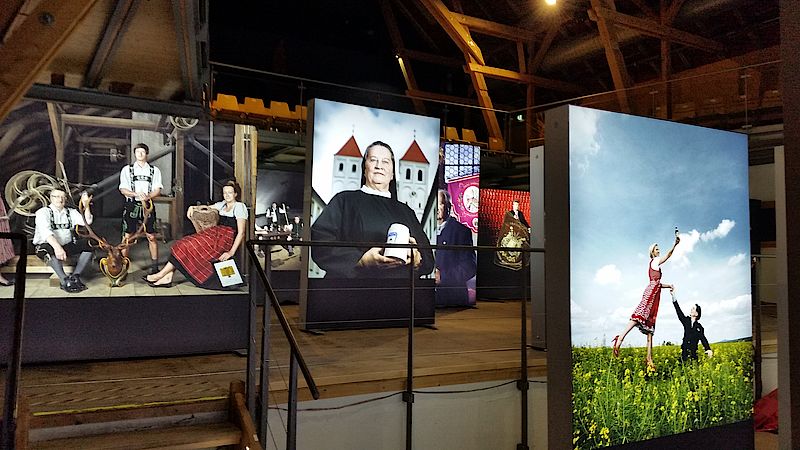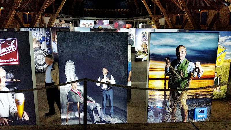 Zwischen den wie Stelen auf verschiedenen Ebenen aufgestellten und illuminierten Aluminium-Lichtkästen können die Ausstellungsbesucher flanieren und interessante Details entdecken. Da sitzt Mario Schäfer, technischer Leiter von Weihenstephan, mit einer historischen Abstechlatte zum Messen der heißen Würzemenge im gemauerten Gewölbe vor dem Korbinian-Brünnlein. Hier sollen die Mönche vor Jahrhunderten die Quelle gefunden haben, aus deren Wasser sie ihr Bier brauten. Und hinter der würdevollen Erscheinung von Monica Reichsgräfin von Arco auf Valley – im Hintergrund eine historische Dampfmaschine zur Energieerzeugung - verbirgt sich ein geschichtliches Drama. In ihren Händen hält die Leiterin der Gräflichen Brauerei Arco Valley ein gerahmtes Telegramm von 1906. Darin wurde der Graf im Arco-Palais in München darüber informiert, dass Schloß Adldorf komplett abgebrannt sie, die Herrschaft jedoch wohlauf sei.
