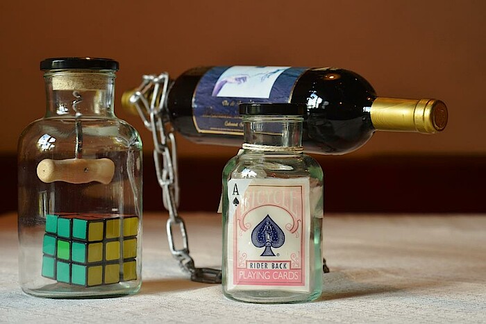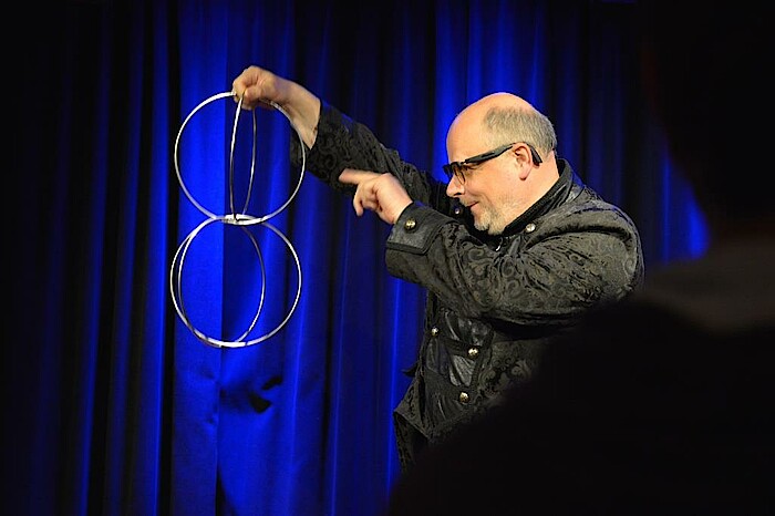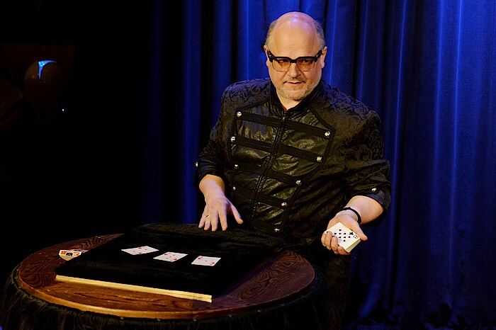Das Zaubermenü dauert knappe drei Stunden, wobei das Essen für vier Zau-ber-Episoden unterbrochen wird. Die präsentierten insgesamt elf Tricks wären an sich schon beeindruckend, sind aber zur besseren Unterhaltung in kleine Geschichten eingepackt. Das führt dann im einen Fall dazu, dass Siri - das sprachgesteuerte Assistenzsystem im iPhone - auf Anfrage des Magiers die beiden Karten benennt, die zwei Gäste dem Stapel entnommen hatten.