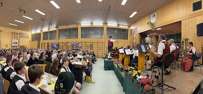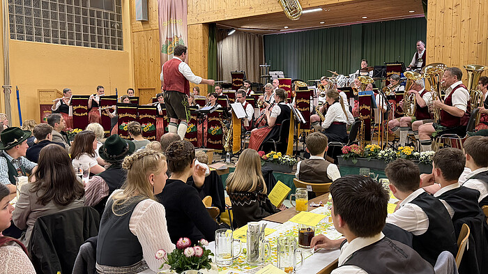 Ein letztes Mal leitete Alfred Menzinger die Kapelle, ehe Walter Hofner aus Münsing den Taktstock übernehmen wird. Sie präsentierten heuer ein „nachhaltiges Hitcycling-Konzert“, sozusagen ein „Best-of“ aus all den Jahren. Begrüßt wurden natürlich wie gewohnt die Ehrengäste im Saal, darunter Eurasburgs Bürgermeister Moritz Sappl und der kommende neue Landrat Ludwig Schmid, sowie Musiker und Trachtler aus der Umgebung. Beim Osterkonzert geht es gemütlich zu. Neben der musikalischen Unterhaltung gehört auch das Get-together dazu. „Grias di“, „servus“, Schulterklopfen. Die einen stehen zwischen den langen Tischreihen und unterhalten sich, die anderen lassen es sich schon schmecken. Kinder in der Tracht laufen herum oder haben Buntstifte bekommen und malen Blaskapellen-Bilder aus.