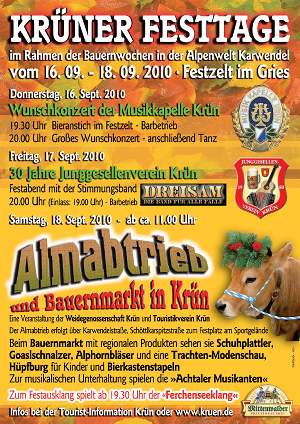 Beim Krüner Almabtrieb wird das prachtvoll geschmückte, heimkehrende Weidevieh gegen 11.00 Uhr durch den Ort zum Festgelände getrieben.