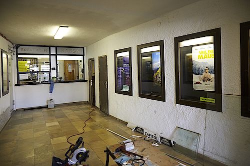 Rund 100 000 Euro investierte der Betreiber des Kinos, Roland Wolf, in die Renovierung des Lichtspieltheaters. Im Mittelpunkt der Arbeiten standen die Sanierung der Toiletten und des großen Saals („Capitol“) mit seinen 300 Sitzplätzen. Auch das Kinofoyer wurde verbessert. Zum Beispiel wurde die Kasse mit einer neuen, großen Glasscheibe ausgestattet, so dass Besucher nicht länger nur über die Schalteraussparung mit dem Kassier in Kontakt kommen. „Offener, freundlicher“ werde sich der Kassenbereich nun anfühlen, verspricht Spiegel. Sowohl der typische, gelb-braune Steinboden wie auch die in der Wand eingelassenen Schaukästen aber sind geblieben. „Das sind typische Elemente der 1950er Jahre, daran rütteln wir nicht“, sagt Spiegel. Die große, ursprünglich hölzerne Treppe hinauf ins Capitolkino erhielt einen eleganten, dunkelroten Teppich. Die Glasvitrine im Treppenaufgang wird Raum bieten für eine kleine Ausstellung über die Geschichte des Hauses. Im Capitol blieben zwar die Sitze und der Teppich, doch die Wände wurden neu mit Stoff bespannt. Eine neue Leinwand wird von nun an zeitgemäße Bildqualität bieten. Um den Charakter des Hauses zu unterstreichen, ließ Spiegel zudem neue, aber stilechte Lampen installieren.