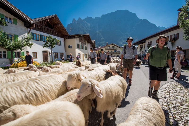 Mittenwald gilt mit rund 1600 Schafen und 70 Haltern übrigens als Hochburg der Bergschafhaltung in Bayern. Das Mittenwalder Bergschaf ist eine eigene Rasse, deren Wolle für Decken oder Matratzen verwendet wird. Die Hirten und Bauern mit ihren "Rindviechern“ feiert man bei den Krüner Festtagen von 17. bis 19. September. In Mittenwald werden Hüter und Kühe einen Tag später, am 20. September durch den Ort ziehen und freudig zurück im Tal begrüßt. Nur wenn die Tiere heil über den Sommer gekommen sind, werden sie prächtig geschmückt – „aufgekranzt“. Zu guter Letzt folgt am 27. September der Rossabtrieb in Mittenwald.