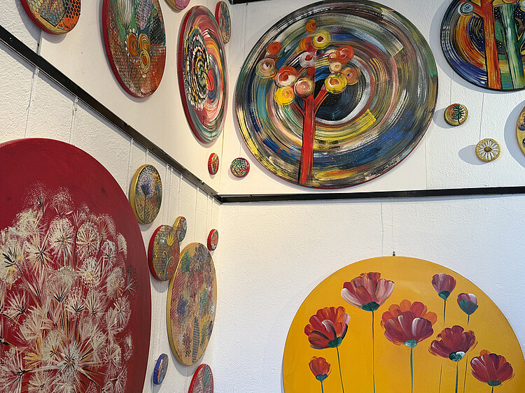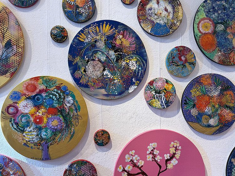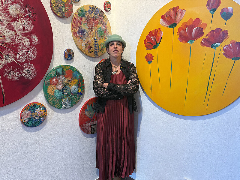 Im Hollerhaus zeigt sie nun ihre neue Werkreihe „Im Kreis der Flora“. Auf kreisrunden Leinwänden hat Karadim in Acryl märchenhafte Blumenwelten geschaffen: verschlungene Pflanzenformen, leuchtende Farben und detailreiche Kompositionen. Die Motive wirken zugleich dynamisch und ruhig – fast so, als würden sich die Bilder wie Kreisel an der Wand drehen.
