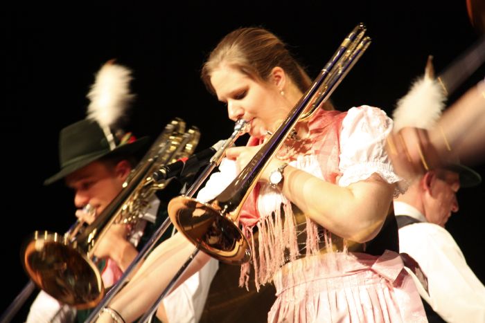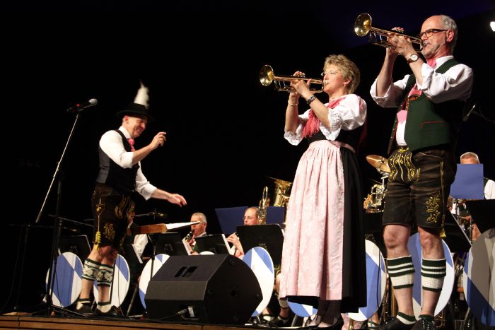Wolfratshausen, 20.5.2013 (red) – Fesche Burschen in Lederhos‘n, Wadlwärmer und Trachtenhüten kamen auf die Bühne der Loisachhalle am Samstagabend, unter ihnen zwei Damen im festlichen Dirndlgewand – allesamt hatten ihre Blasinstrumente unterm Arm und nahmen ihren Platz ein. Mit dem bayerischen Defiliermarsch begann ein langer Konzertabend und endete vor der Zugabe mit dem berühmten Radezky-Marsch. Dazwischen nahm das Konzert von Adi Stahuber und seiner original Isartaler Blaskapelle überraschend moderne Töne an.
