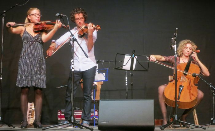 Hingerissen waren die Zuschauer auch von den schneidigen Well-Cousinen Maria Well und Maresa Well und Alexander Maschke. Mit der lebhaften und swingenden finnischen Polka zeigten sie gleich zu Beginn, dass sie an Temperament den Gummistiefeltänzern in nichts nachstehen. Es folgten Eigenkompositionen und Arrangements traditioneller Stücke in einem Crossover von Volksmusik, über freche Lieder bis hin zu klassischen Stücken. Die drei Musiker boten mit unterschiedlichen Instrumenten (Geige, Bratsche, Cello, Akkordeon) ein gekonntes und abwechslungsreiches Programm.
