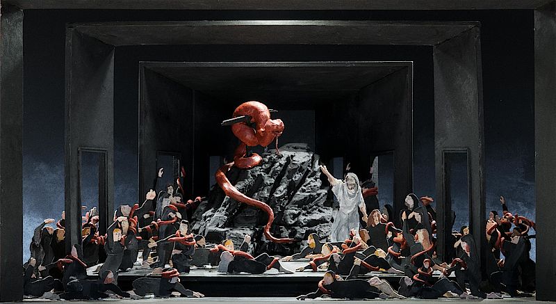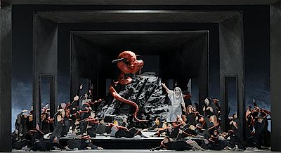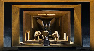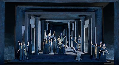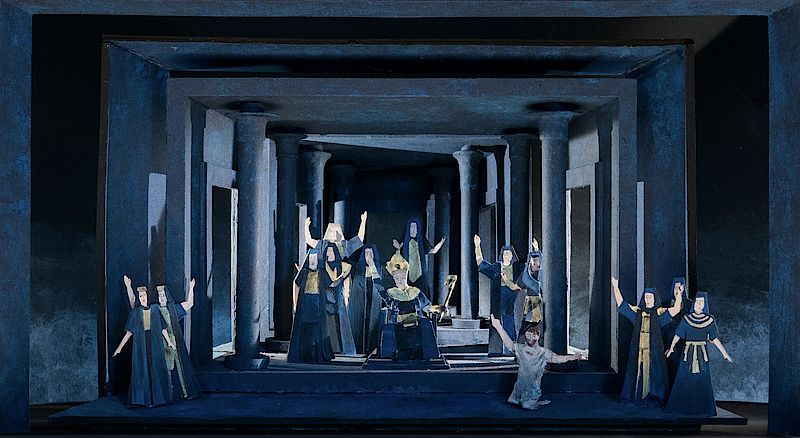 Während diese Bilder in starken Farben gestaltet werden, setzt Hageneier für die Spielszenen auf „Farblosigkeit“: „Ich habe hier eine 45 Meter breite Bühne und einen großen Zuschauerraum. Da brauche ich eine Fernwirkung“, erklärt er. „Auch spielen wir ja zum Großteil bei Tageslicht und haben keine Lichtführung. Das Volk muss also in die Bühne integriert werden und optisch in den Hintergrund rücken, damit die Hauptfiguren vorne gut zur Geltung kommen.“ Die Grundfarbe der Bühne bildet diesmal also auch die Grundfarbe der Kostüme für das Volk. Hageneier reaktivierte die Kontakte zu seinen Stofflieferanten in Indien, schickte ihnen beige-graue Farbproben der Bühne und Entwürfe für Muster – und gab tausende Meter Stoff in Auftrag. Diese werden kombiniert mit alten Stoffen.