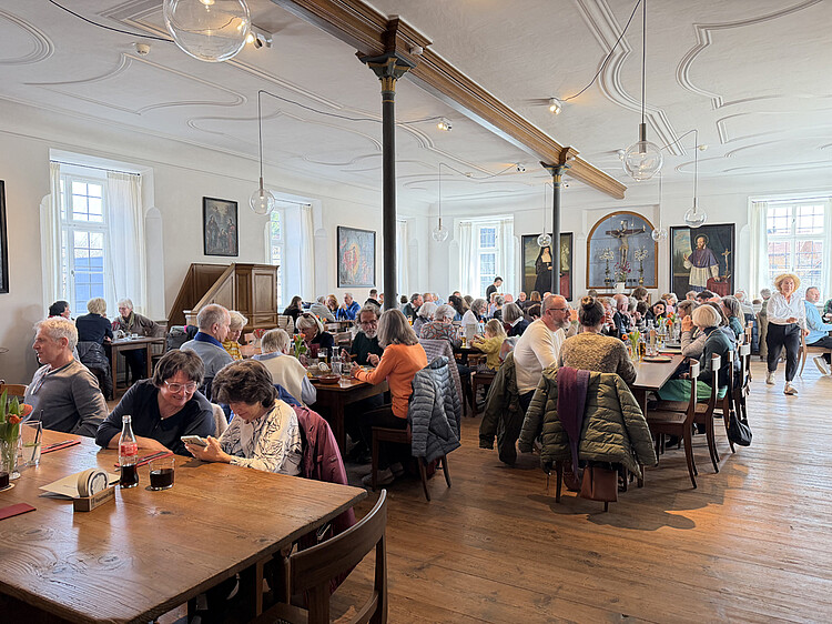 Auch kulinarisch hatte der Markt einiges zu bieten. Im Refektorium waren zur Mittagszeit am Samstag alle Plätze besetzt. Auf der Speisekarte standen unter anderem Kloster-Sauerteig-Suppe oder Lachsforellenfilet im Pergamentpapier. Zum Mitnehmen gab es Bratwurst oder von der klostereigenen Backstube frische Schmalz-Striegel.