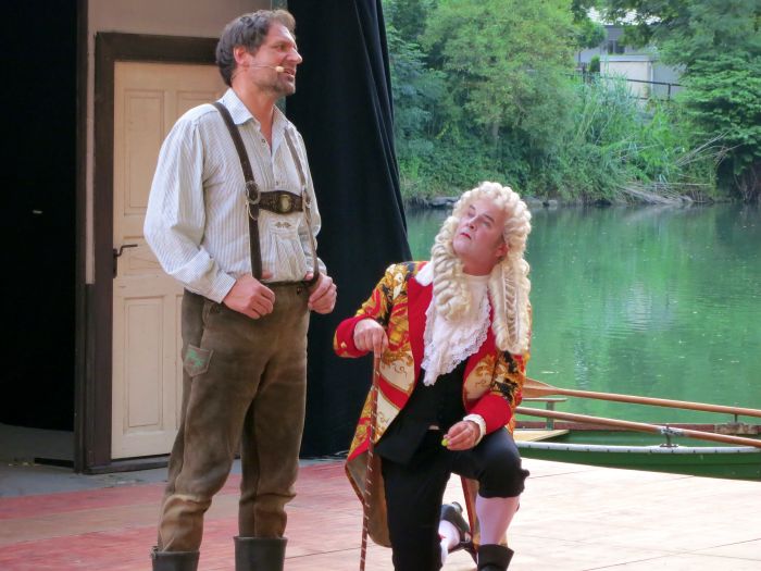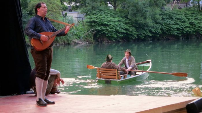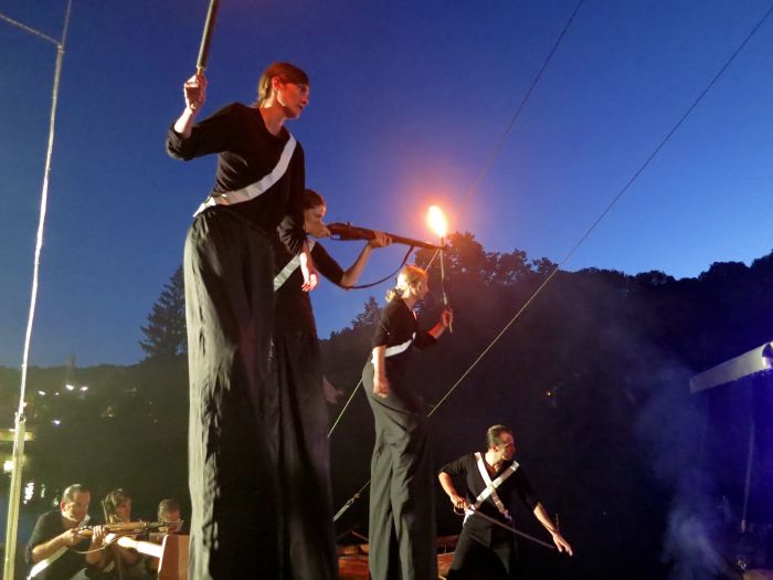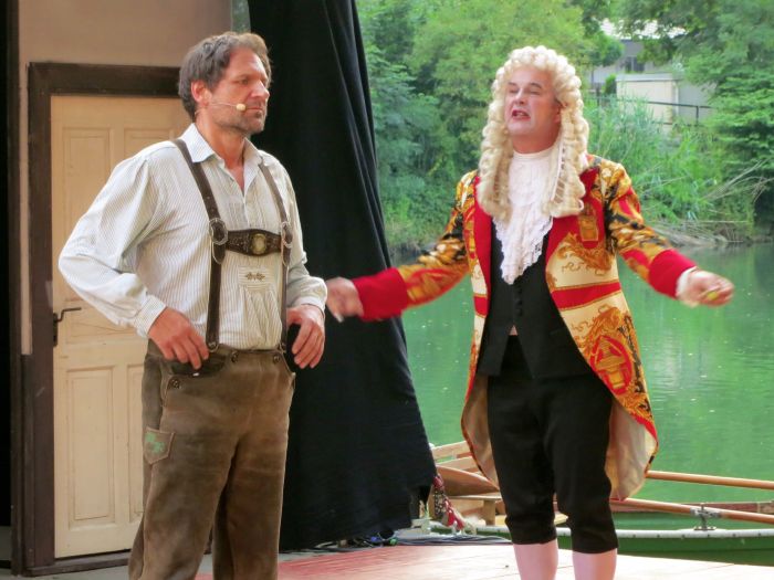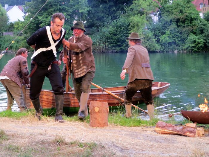Wagner ist Musiker, Liedermacher, Autor und Leiter des schon jetzt legendären Wolfratshauser Flussfestivals. Der Regisseur Helfrich ist bekannt auch vom Chiemgauer Volkstheater. Dass Liedermacher Konstantin Wecker auch noch die Musik für dieses Theaterspektakel geschrieben hat, setzt dem ganzen noch die Krone auf. Und dann das Bühnenbild, das vermutlich kaum ein Theater der Welt so lebensecht gestalten kann: die gemächlich fließende Loisach, der Blick auf die Skyline der Altstadt von Wolfratshausen und den Bergwald und viel Platz außerhalb des Bühnenfloßes für das Schlachtengetümmel. Einfach fabelhaft. Die Zuschauer unter dem Zeltdach auf dem Festivalgelände waren von der ersten Minute an ergriffen, hielten den Atem an, ballten die Fäuste, wurden fast ein Teil des Stückes. Vor allem aber spendeten sie reichlich Szenenapplaus und feierten Ensemble, Autor und Regisseur am Schluss des mitreißenden Abends im Stehen. Im Theater wären das mindestens sechs Vorhänge gewesen.