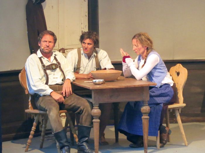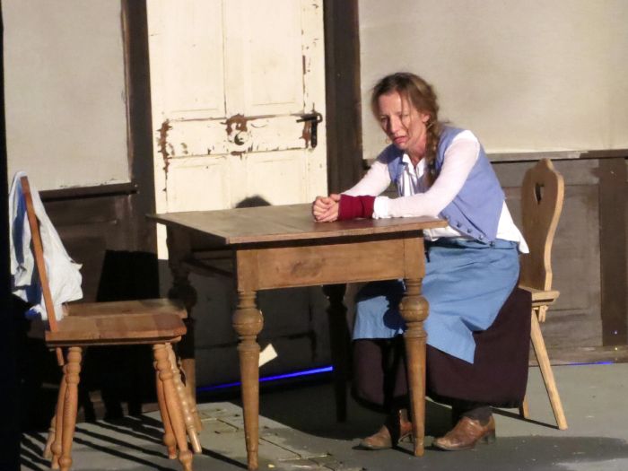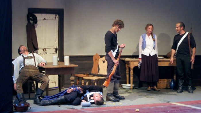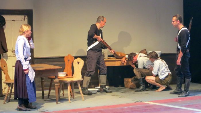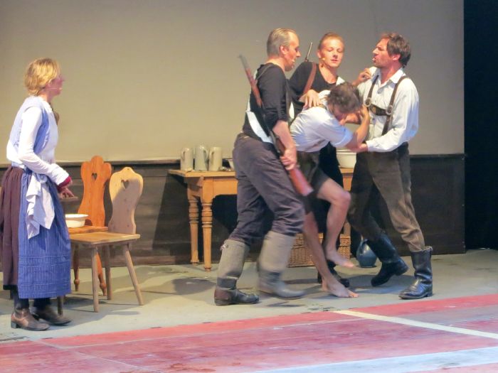 Die ruhige Szene am Anfang des sonst temporeichen Stückes veranschaulicht eindringlich, wie schlecht es den Menschen geht. Da klopft es derb an die Tür. Ein Soldat will den blutjungen Bauernsohn Sebastian (Andi Mittermeier) einziehen. Der verrohte Uniformierte schlägt den kriegsversehrten Bauern nieder und versucht, seine Frau zu vergewaltigen. Eine der vielen starken und fast nicht zu ertragenden Szenen. Klinger rafft seine letzten Kräfte zusammen, tötet den Soldaten und steckt seinen Sohn als Tarnung in eine Uniform. Schon bei dieser Anfangsszene stockt den Zuschauern der Atem ob des eindringlichen Spiels der Akteure.