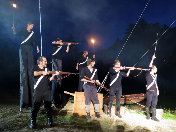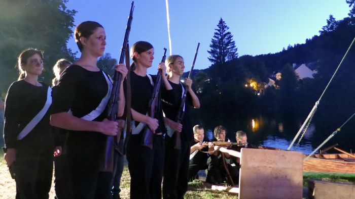Doch die Zuschauer bleiben sitzen und verfolgen fast atemlos das weitere Geschehen, von dem Historiker berichten, wie blutig und gnadenlos der Aufstand in der Heiligen Nacht in Sendling mit 1100 toten Bauern niedergeschlagen wurde. Auf der Bühne und am Loisachufer wird gelitten, gekämpft und gestorben. Ein Feuer wird entzündet, das Natur-Bühnenbild macht sogar das Rudern im Fluss möglich. Drohend wummern die Trommeln der Soldaten im Pulverdampf. Sie kommen immer näher, zücken ihre Gewehre und Bajonette. Zu allem entschlossen und mordlüstern sind diese Soldaten (Jörg Schwenger, Lukas Wolf und Manfred Schmidbauer u.v.a.m.) Manche der Krieger stehen am Loisachufer mit meterhohen Stelzen, was die Ohnmacht der todesmutigen Aufständischen noch mehr unterstreicht und die Zuschauer frösteln lässt.