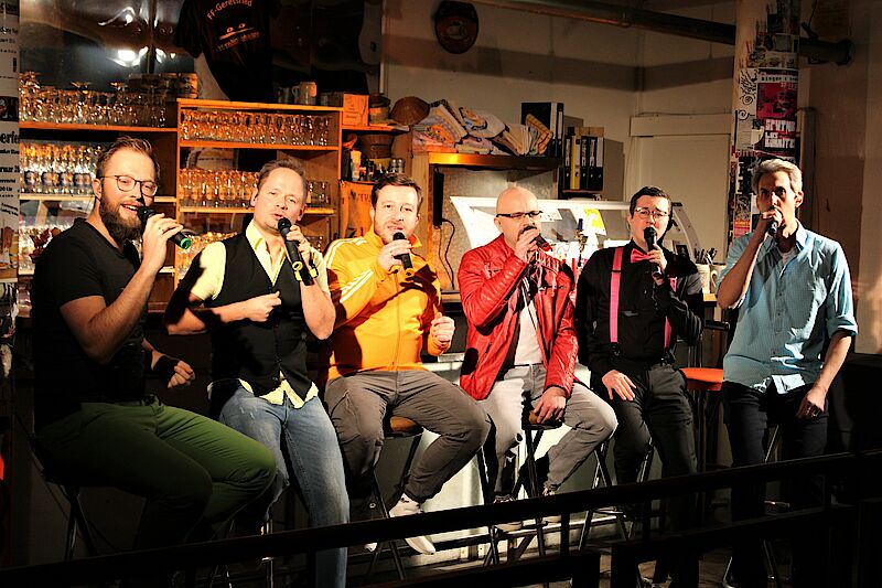 Für das Eröffnungsstück „Can’t wait until tonight“ setzten sie sich lässig auf die Barhocker, um kurz darauf im Gänsemarsch wieder die Bühne zu betreten. Es folgten Eigenkompositionen und beeindruckende Interpretationen von bekannten Hits. So hätte der verstorbene Queen-Sänger Freddie Mercury bestimmt viel Freude an der schwungvollen aMuSing-Variation des von ihm komponierten Songs „Crazy litte thing called love“ gehabt. Und auch „Ich bin nur gut, wenn keiner guckt“ muss sich vor dem Original von Max Raabe nicht verstecken. Zum krönenden Abschluss des kurzweiligen Konzerts ließ der großgewachsene Chrissi in der Rammstein-Veräppelung „Zahn der Zeit“ noch mal seine tiefe Bassstimme ertönen und sorgte so für begeisterte Kommentare im Live-Chat. So haben bisher über 1000 Zuhörer aus ganz Deutschland die Aufzeichnung auf dem youtube-Kanal der Kulturbühne Hinterhalt angeklickt.