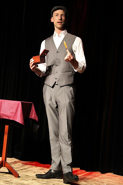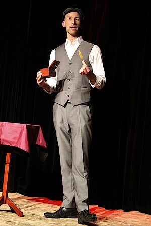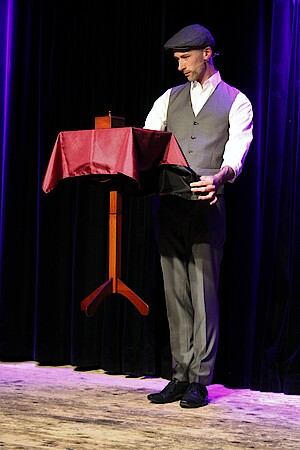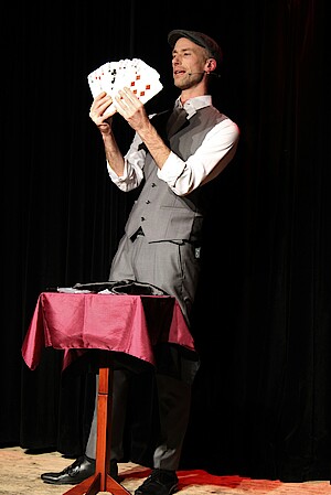 Von Hütchenspielern, die mit hoher krimineller Energie Passanten abzocken, distanzierte sich Maier auf selbstironische Art. „Ich betrüge Sie auch, sag’s Ihnen aber vorher: Das ist der Unterschied“, verriet er dem Publikum. Begleitet von Hintergrundmusik und anderen Geräuschen, präsentierte Maier daraufhin einen als Zeitmaschine titulierten Holzkasten, der verdrehte Zauberwürfel und zerrissene Seile wieder in ihren ursprünglichen Zustand zurückverwandeln konnte. Höhepunkt der kurzweiligen Show war zweifellos Maiers finale Aufforderung an die Zuschauer, die auf den einzelnen Tischen liegende Kartenstapel zu zerreißen und in beliebiger Reihenfolge zu verteilen. Als am Ende jeder Besucher nur noch jeweils zwei Fetzen in Hände hielt und diese Puzzleteile wie ein Wunder zueinanderpassten, war das Erstaunen und der Applaus groß.