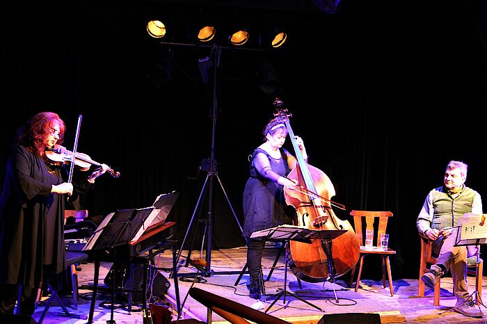Zu einem improvisierten Dialog zwischen der als Kaiserin Sissi sprechenden Lizzy Aumeier und Kaiser Franz erklärte sich Norbert Gentz, der als aktives Mitglied und Veranstalter des Kulturvereins Isar-Loisach (KIL) live dabei war. Besonders beeindruckend präsentierte Lizzy Aumeier am Kontrabass mit ihrer musikalischen Partnerin aus ihrem Ensemble "Die weißen Lilien, Svetlana Klimova an der Geige, den besinnliche Kanon des fränkischen Barockkomponisten Johann Pachelbel. In der leider coronabedingten gastlosen Kulturbühne entfaltete dieser Beitrag dennoch eine enorme Klangwirkung.