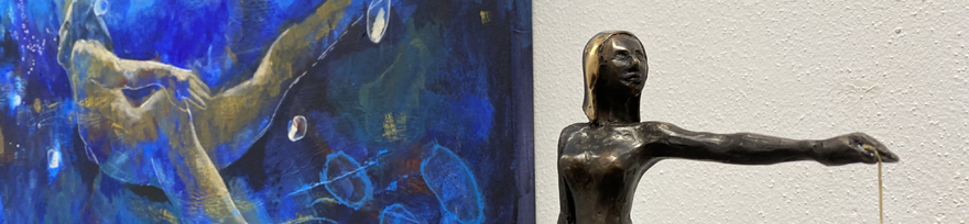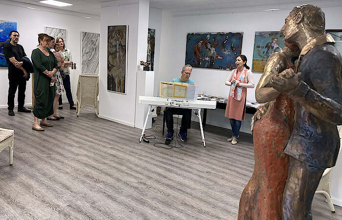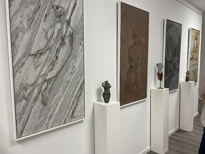 Geretsried, 25.5.2022 – Tanz, Bewegung, Lebensfreude und immer wieder Dinge im Verborgenen sind Motive der Künstlerin Stefanie von Quast. "Man muss nur lange genug hinsehen, dann entstehen Wesen, die vorher nicht da sind. „Meine Aufgabe ist es, sie für Sie sichtbar zu machen“, erklärte die Malerin und Bildhauerin ihre neuen Arbeiten von 2022 bei der Eröffnung der Ausstellung in der Galerie an der Elbestraße, mit musikalischer Umrahmung von Elsa Kodeda (Gesang) und Tobias Woitun (Klavier) der Geretsrieder Musikschule.