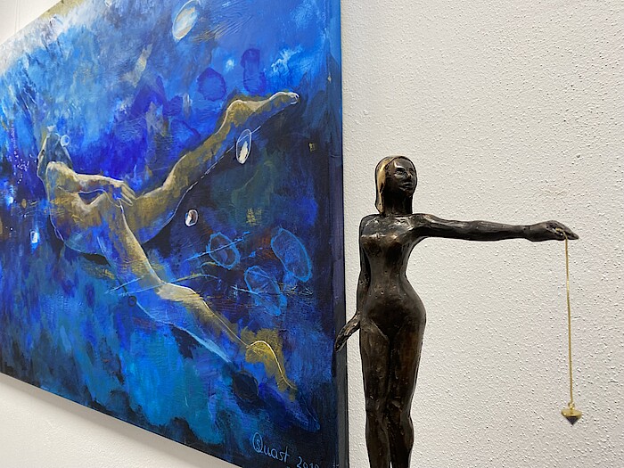 Von Quast hat Malerei und Grafikdesign in den 1980ger Jahren in München studiert und anschließend Bildhauerei in Salzburg. Sie besuchte 1996 ein Symposium für Bronzeguss in Perth Australien und erhielt Kunstpreise für ihre langjährige freischaffenden Tätigkeit. Bekannt ist von Quast auch für ihre skulpturalen Arbeiten mit Bronzeguss in Verbindung von Halbedelsteinen. Zum Beispiel sitzen drei weibliche Figuren auf je einer Stehle und haben die Pumps lässig ausgezogen. Unter dem Titel „Momentan nicht erreichbar“ genießen sie das Leben. In diesen schwierigen Zeiten will die Künstlerin Freude, Verbundenheit und gute Gefühle schenken.