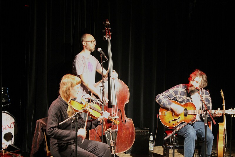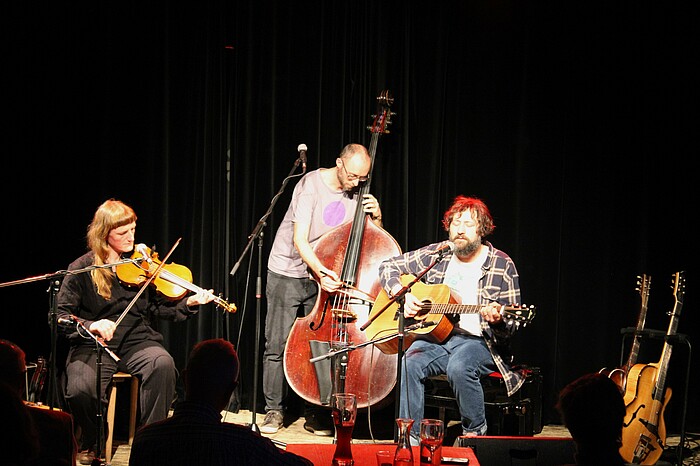 Benni Schäfer (Bass, Gesang) und Matze Brustmann (Gitarre, Gesang) können getrost als musikalische Stammgäste der Kulturbühne Hinterhalt bezeichnet werden. Seit den 1990er-Jahren traten sie dort in Bands wie Los Burritos, Max.Bab, Dreiviertelblut und Balloon Pilot auf. Evi Keglmaier - bekannt als Mitglied der Hochzeitskapelle - begleitete die beiden nun wahlweise mit Geige und Akkordeon. Nach dem neuen Eröffnungsstück „0rigami Trail“ spielte das Trio auch viele Songs aus den vorangegangen Alben. Dabei wurde vor allem die Titelnummer der CD „Blankets“ ihrem Namen gerecht. Wie eine warme Decke hüllte die dezente Stimme Brustmanns die gebannt lauschenden Zuhörer ein. Zwischendurch gaben die Musiker sogar einen von Evi Keglmaier komponierten Walzer zum Besten. Inspiration für weitere Lieder holte sich Brustmann unter anderem beim Kajakfahren („Here goes my sleep“) oder bei seiner jungen Tochter Selma „You'll be a part of mine“.